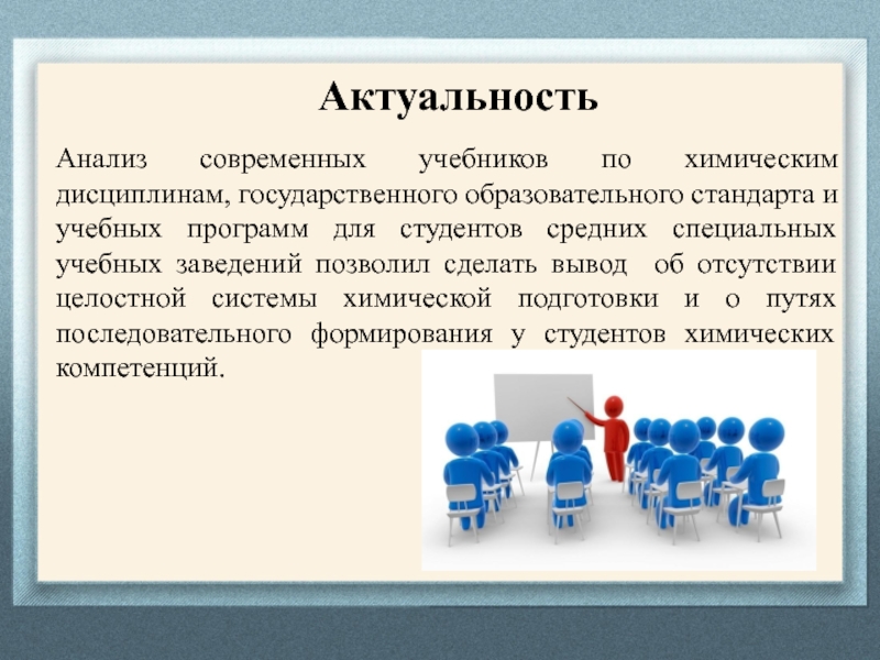 АктуальностьАнализ современных учебников по химическим дисциплинам, государственного образовательного стандарта и учебных программ для студентов средних специальных учебных
