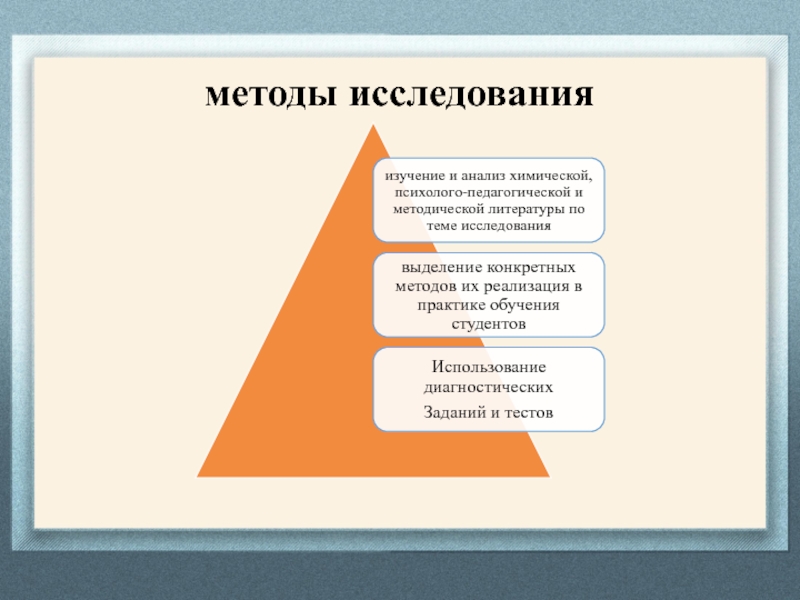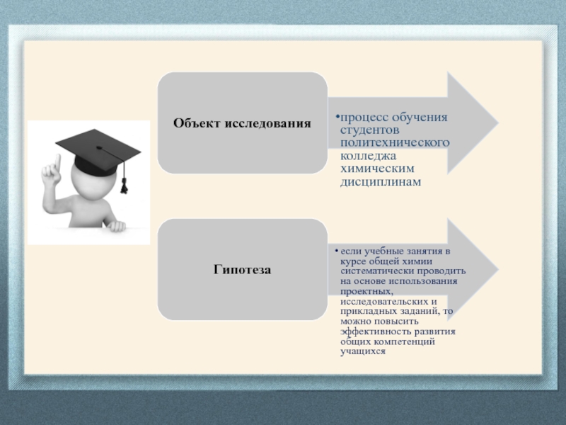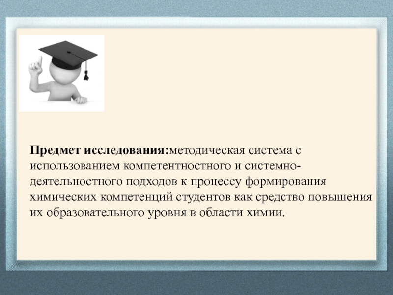 Предмет исследования:методическая система с использованием компе­тентностного и системно-деятельностного подходов к процессу формирования химических компетенций студентов как