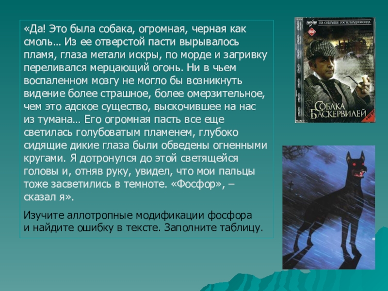 пасти вырывалось пламя, глаза метали искры, по морде и загривку переливался мерцающий огонь. Ни в чьем воспаленном мозгу не могло бы возникнуть видение более страшное, более омерзительное, чем это адское существо, выскочившее на нас из тумана… Его огромная пасть все еще светилась голубоватым пламенем, глубоко сидящие дикие глаза были обведены огненными кругами. Я дотронулся до этой светящейся головы и, отняв руку, увидел, что мои пальцы тоже засветились в темноте. «Фосфор», – сказал я».