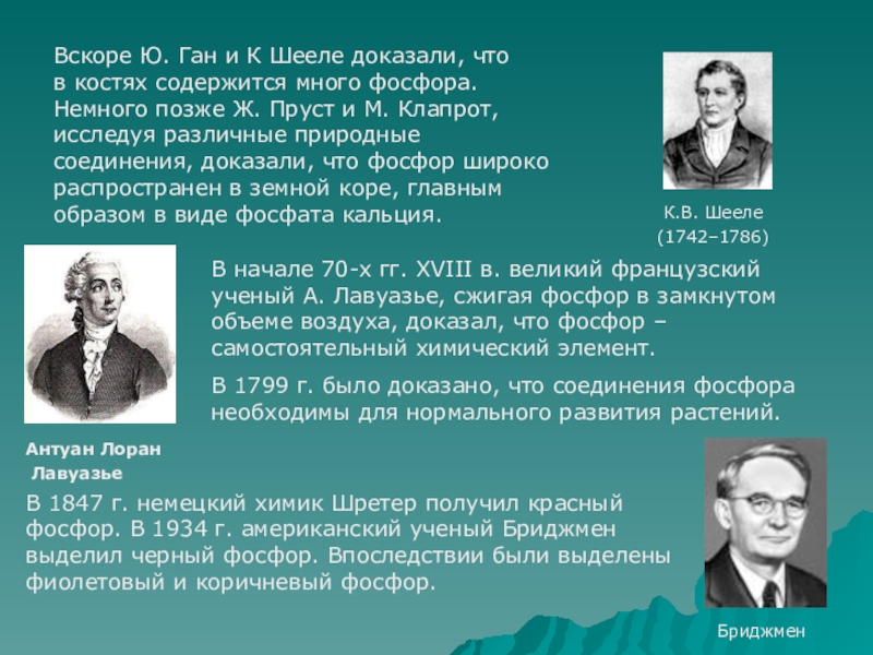 Немного позже Ж. Пруст и М. Клапрот, исследуя различные природные соединения, доказали, что фосфор широко распространен в земной коре, главным образом в виде фосфата кальция.