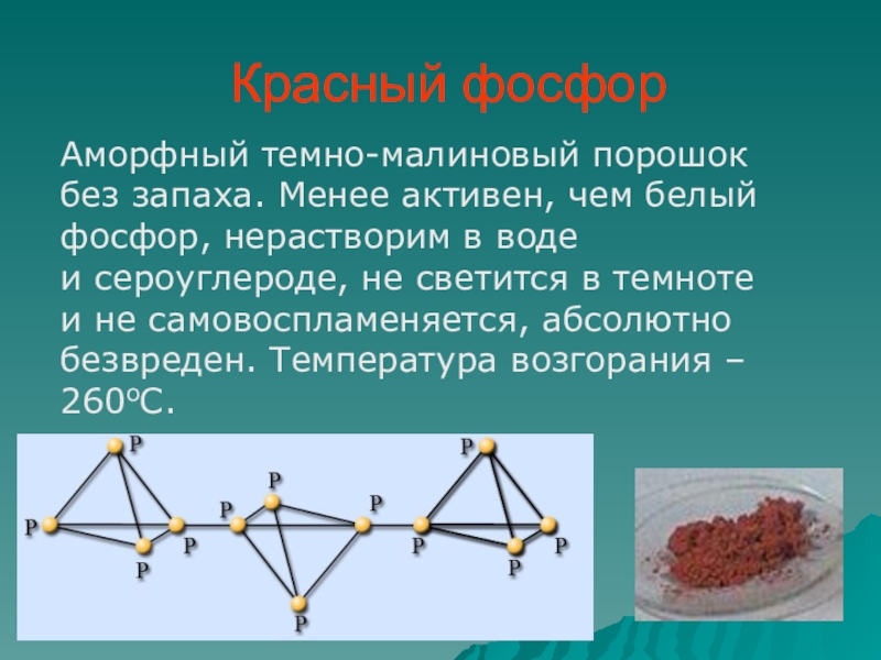 Аморфный темно-малиновый порошок без запаха. Менее активен, чем белый фосфор,