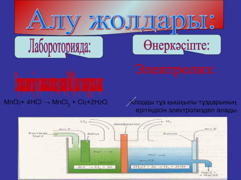 MnO2+ 4HCl → MnCl2 + Cl2+2H2O. Хлорды тұз қышқылы тұздарының