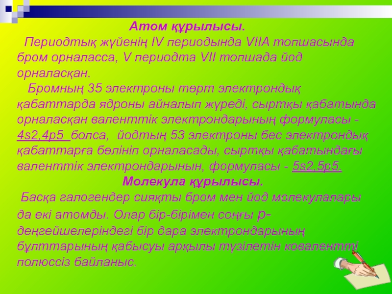 Бромның 35 электроны төрт электрондық қабаттарда ядроны айналып жүреді, сыртқы қабатында орналасқан валенттік электрондарының формуласы - 4s2,4p5 болса, йодтың 53 электроны бес электрондық қабаттарға бөлініп орналасады, сыртқы қабатындағы валенттік электрондарынын, формуласы - 5s2,5p5.