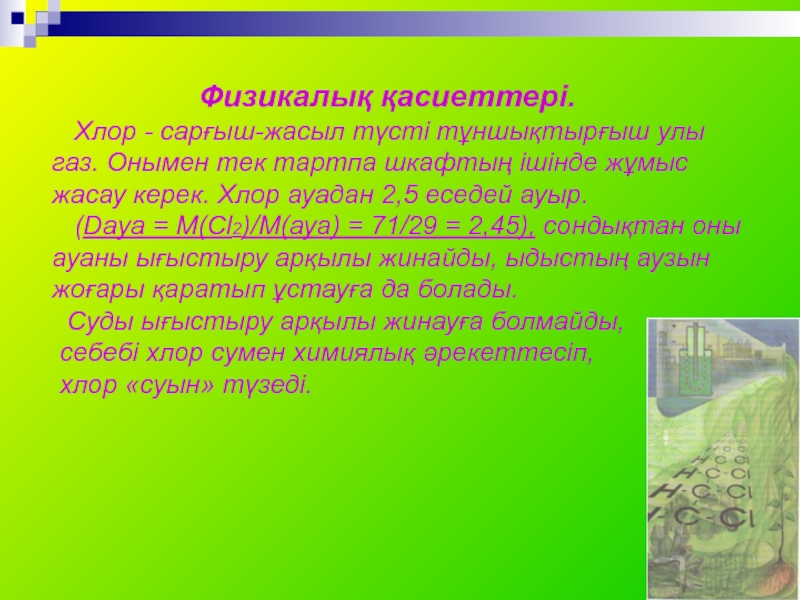 Хлор - сарғыш-жасыл түсті тұншықтырғыш улы газ. Онымен тек тартпа шкафтың ішінде жұмыс жасау керек. Хлор ауадан 2,5 еседей ауыр.