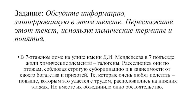 В 7-этажном доме на улице имени Д.И. Менделеева в 7 подъезде жили химические элементы – галогены. Расселились они по этажам, соблюдая строгую субординацию и в зависимости от своего богатства и прихотей. Те, которые очень любят полетать – повыше, которым это удается с трудом, расположились на нижних этажах. Но вместе их объединило одно обстоятельство.