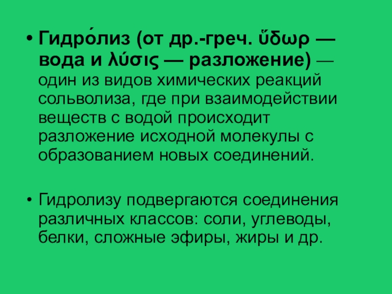 Слайд 2Гидро́лиз (от др.-греч. ὕδωρ — вода и λύσις — разложение) —