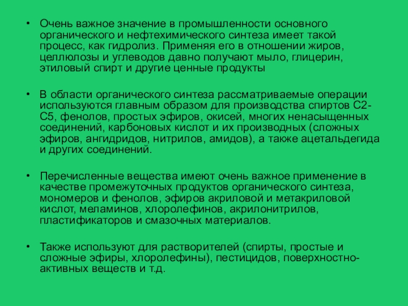 В области органического синтеза рассматриваемые операции используются главным образом для производства спиртов С2-С5, фенолов, простых эфиров, окисей, многих ненасыщенных соединений, карбоновых кислот и их производных (сложных эфиров, ангидридов, нитрилов, амидов), а также ацетальдегида и других соединений.