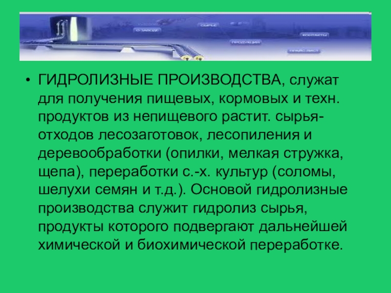Слайд 12ГИДРОЛИЗНЫЕ ПРОИЗВОДСТВА, служат для получения пищевых, кормовых и техн. продуктов из