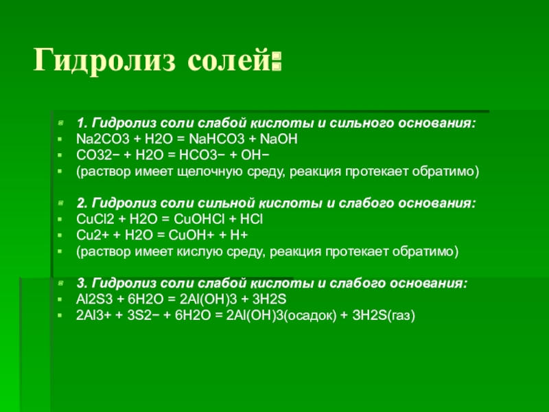 Гидролиз солей:1. Гидролиз соли слабой кислоты и сильного основания:Na2CO3 + Н2О = NaHCO3 + NaOHCO32− + H2O = HCO3− + OH−(раствор имеет щелочную среду, реакция протекает обратимо)2. Гидролиз соли сильной кислоты и слабого основания:CuCl2 + Н2О