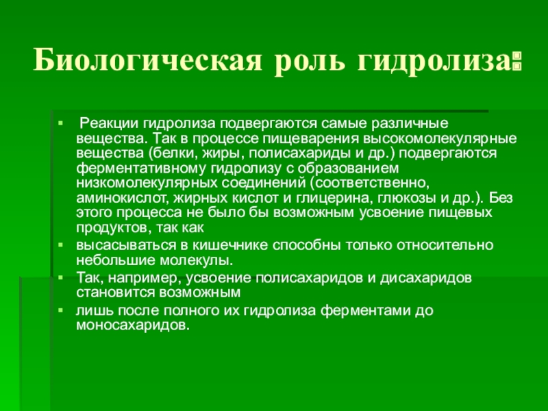 Биологическая роль гидролиза: Реакции гидролиза подвергаются самые различные вещества. Так в процессе пищеварения высокомолекулярные вещества (белки, жиры,