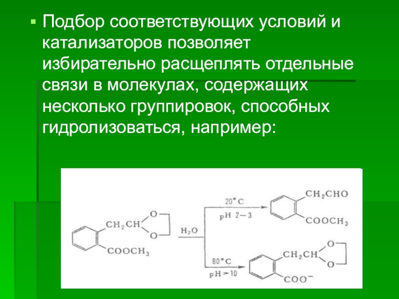 Подбор соответствующих условий и катализаторов позволяет избирательно расщеплять отдельные связи в молекулах, содержащих несколько группировок, способных гидролизоваться,