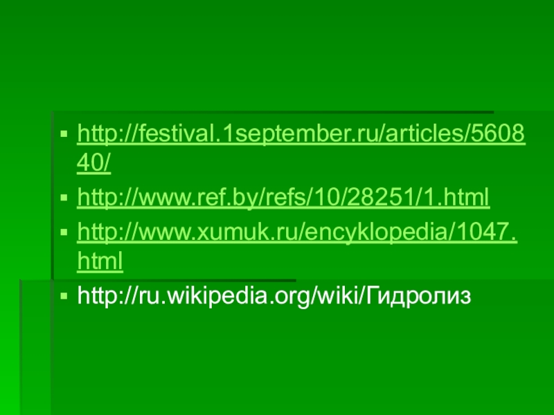 http://festival.1september.ru/articles/560840/http://www.ref.by/refs/10/28251/1.htmlhttp://www.xumuk.ru/encyklopedia/1047.htmlhttp://ru.wikipedia.org/wiki/Гидролиз