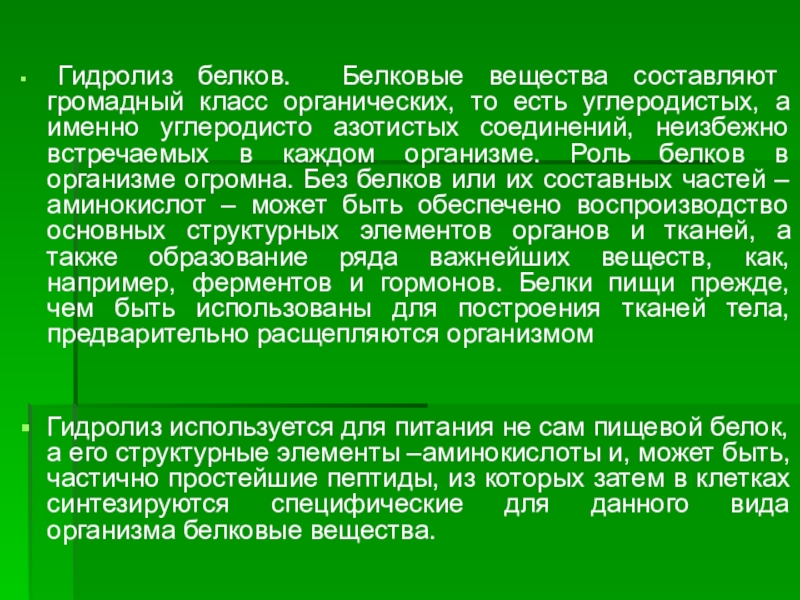 Гидролиз белков. Белковые вещества составляют громадный класс органических, то есть