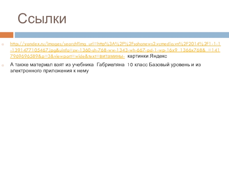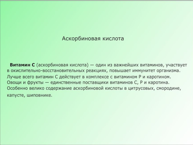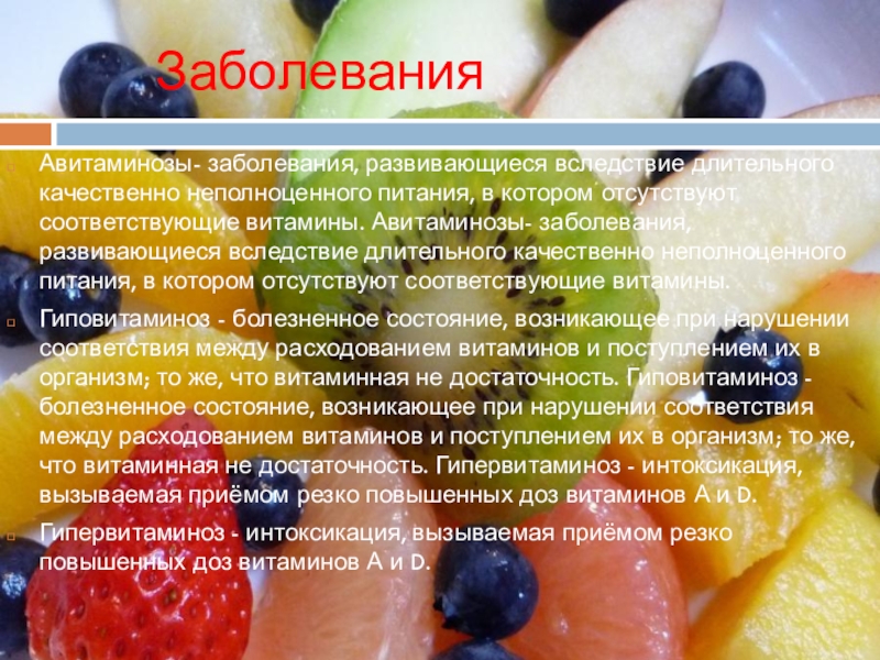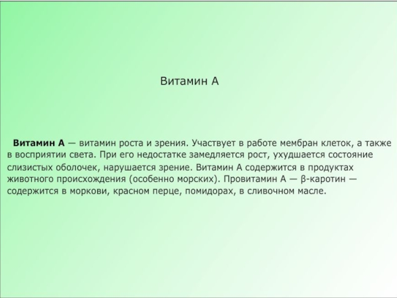 соединения различной химической природы, абсолютно необходимые для нормальной жизнедеятельности организмов. Являются незаменимыми пищевыми веществами. Некоторые витамины могут продуцироваться нормальной микрофлорой кишечника. В отличие от всех других жизненно важных пищевых веществ витамины не обладают пластическими свойствами и не используются организмом в качестве источника энергии. Участвуя в разнообразных химических превращениях, они оказывают регулирующее влияние на обмен веществ и тем самым обеспечивают нормальное течение практически всех биохимических и физиологических процессов в организме. В настоящее время известно свыше 30 соединений, относящихся к этой группе биологически активных веществ. Витамины (лат. vita жизнь + амины) низкомолекулярные органические соединения различной химической природы, абсолютно необходимые для нормальной жизнедеятельности организмов. Являются незаменимыми пищевыми веществами. Некоторые витамины могут продуцироваться нормальной микрофлорой кишечника. В отличие от всех других жизненно важных пищевых веществ витамины не обладают пластическими свойствами и не используются организмом в качестве источника энергии. Участвуя в разнообразных химических превращениях, они оказывают регулирующее влияние на обмен веществ и тем самым обеспечивают нормальное течение практически всех биохимических и физиологических процессов в организме. В настоящее время известно свыше 30 соединений, относящихся к этой группе биологически активных веществ.