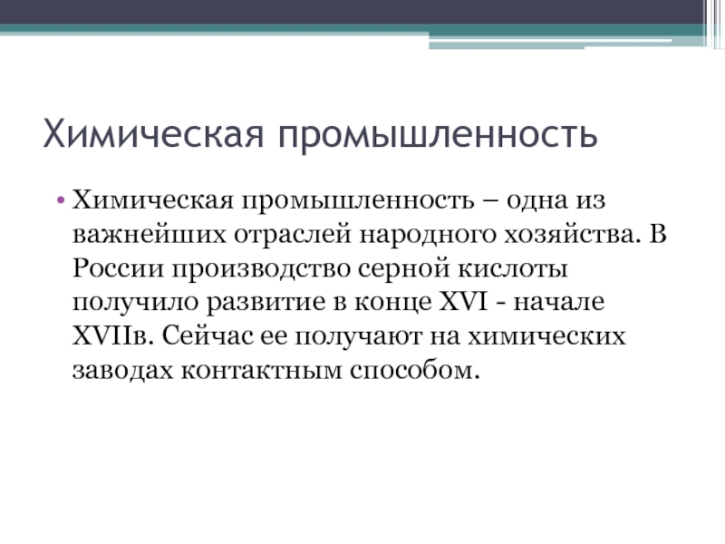 Химическая промышленностьХимическая промышленность – одна из важнейших отраслей народного хозяйства. В России производство серной кислоты получило развитие в конце XVI - начале XVIIв. Сейчас ее получают на химических заводах контактным способом.