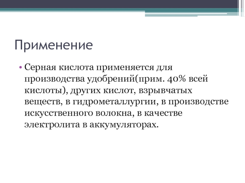 ПрименениеСерная кислота применяется для производства удобрений(прим. 40% всей кислоты), других кислот, взрывчатых веществ, в гидрометаллургии, в производстве