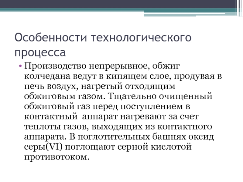 Особенности технологического процессаПроизводство непрерывное, обжиг колчедана ведут в кипящем слое, продувая в печь воздух, нагретый отходящим обжиговым