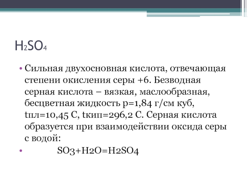 H2SO4Сильная двухосновная кислота, отвечающая степени окисления серы +6. Безводная серная кислота – вязкая, маслообразная, бесцветная жидкость p=1,84