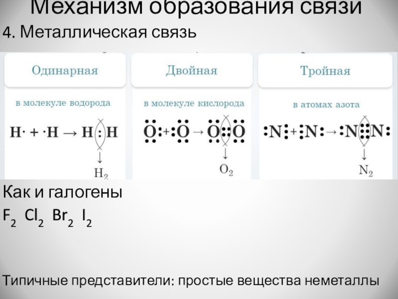 Механизм образования связи4. Металлическая связьКак и галогеныF2 Cl2 Br2 I2 Типичные представители: простые вещества неметаллы