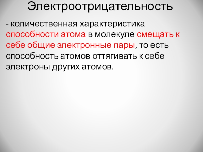 Электроотрицательность- количественная характеристика способности атома в молекуле смещать к себе общие электронные пары, то есть способность атомов