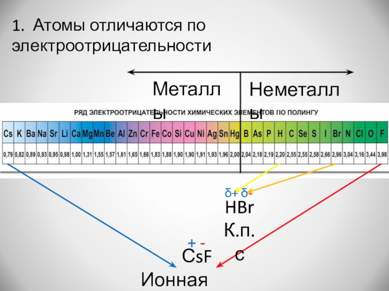 МеталлыНеметаллы1. Атомы отличаются по электроотрицательностиСsFИонная связь+ -HBrК.п.сδ+ δ-