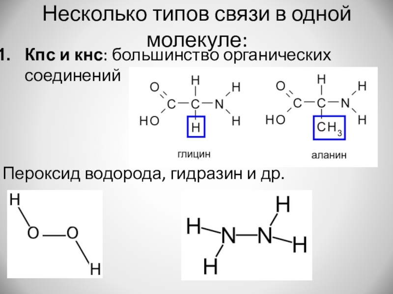 Несколько типов связи в одной молекуле:Кпс и кнс: большинство органических соединенийПероксид водорода, гидразин и др.