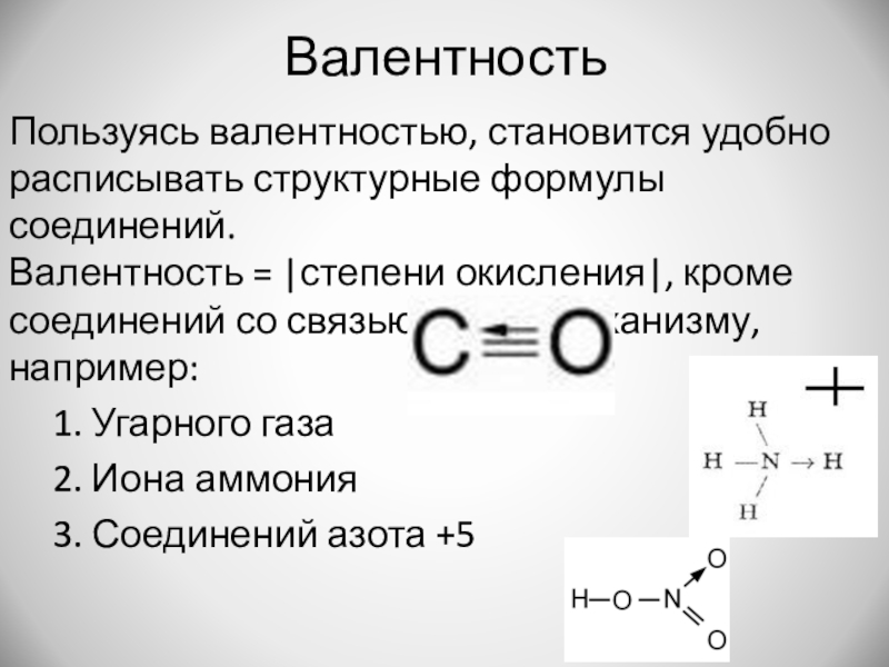 ВалентностьПользуясь валентностью, становится удобно расписывать структурные формулы соединений. Валентность = |степени окисления|, кроме соединений со связью по