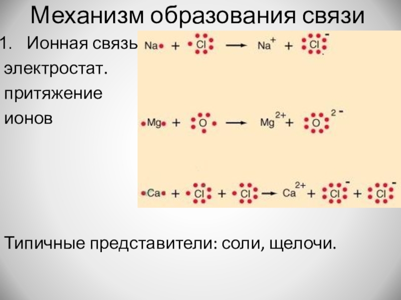 Механизм образования связиИонная связь электростат.притяжение ионов Типичные представители: соли, щелочи.