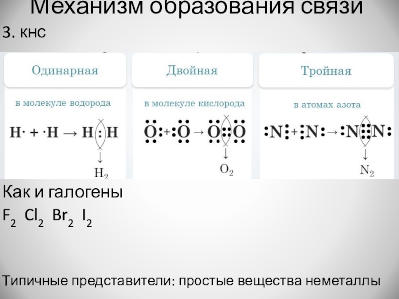 Механизм образования связи3. кнсКак и галогеныF2 Cl2 Br2 I2 Типичные представители: простые вещества неметаллы