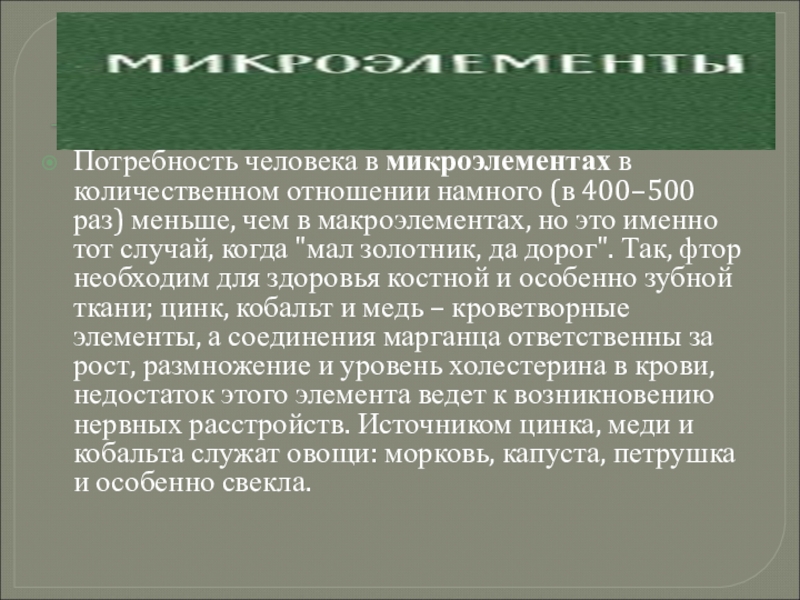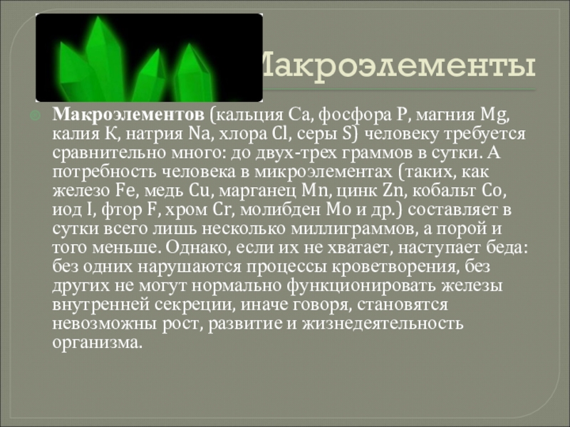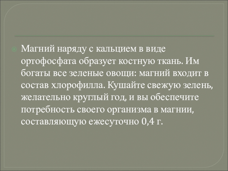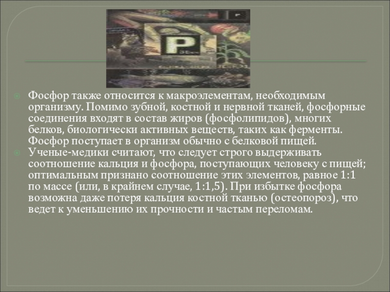 Фосфаты кальция, в частности ортофосфат, составляют минеральную основу костей и зубов. Другие соединения кальция участвуют в нервной и мышечной деятельности, входят в состав тканевой жидкости, ядер и стенок клеточной ткани живого организма. Кальций уменьшает аллергические реакции, а это особенно важно в наше время. Суточная потребность в кальции от 0,8 до 2 г, а источники этого элемента – молоко и кефир, творог, сыр, рыба, фасоль, петрушка, зеленый лук, а также яйца, гречка, овсянка, морковь и горох.