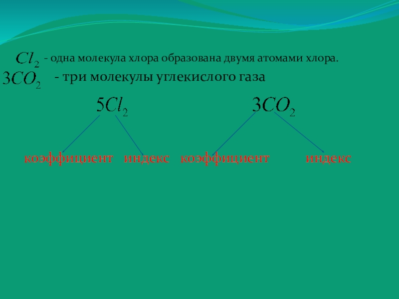 Цифру, показывающую число атомов каждого элемента в молекуле вещества называют индексом. Коэффициент – это число которое ставят перед формулой вещества (или перед символом химического элемента) для образования числа молекул или атомов.