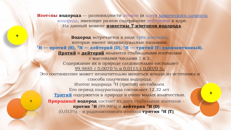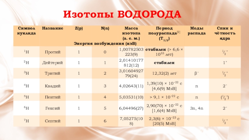1H — протий (Н), 2Н — дейтерий (D), 3Н — тритий (T; радиоактивный).