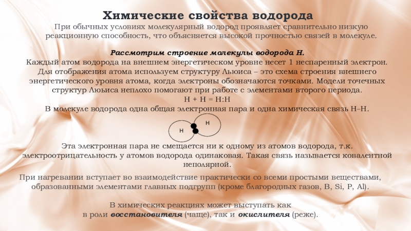 Эта электронная пара не смещается ни к одному из атомов водорода, т.к. электроотрицательность у атомов водорода одинаковая. Такая связь называется ковалентной неполярной.
