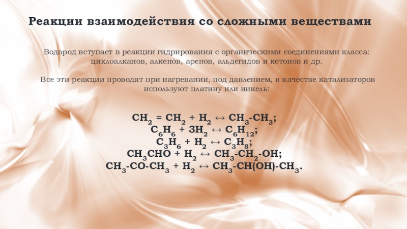 Водород вступает в реакции гидрирования с органическими соединениями класса: циклоалканов, алкенов, аренов, альдегидов и кетонов и др.