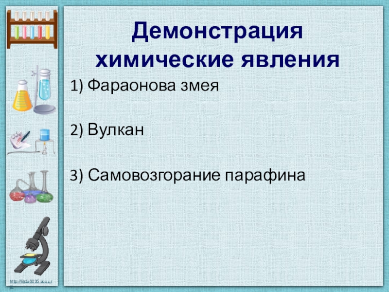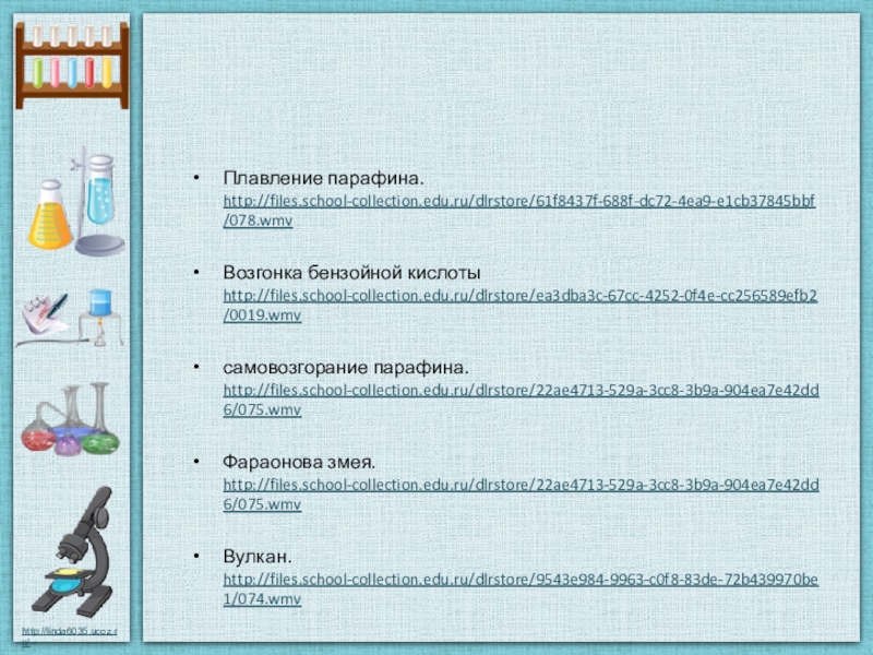 Плавление парафина. http://files.school-collection.edu.ru/dlrstore/61f8437f-688f-dc72-4ea9-e1cb37845bbf/078.wmvВозгонка бензойной кислоты http://files.school-collection.edu.ru/dlrstore/ea3dba3c-67cc-4252-0f4e-cc256589efb2/0019.wmvсамовозгорание парафина. http://files.school-collection.edu.ru/dlrstore/22ae4713-529a-3cc8-3b9a-904ea7e42dd6/075.wmvФараонова змея. http://files.school-collection.edu.ru/dlrstore/22ae4713-529a-3cc8-3b9a-904ea7e42dd6/075.wmvВулкан. http://files.school-collection.edu.ru/dlrstore/9543e984-9963-c0f8-83de-72b439970be1/074.wmv