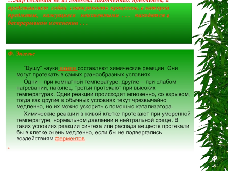 Химические реакции в живой клетке протекают при умеренной температуре, нормальном давлении и нейтральной среде. В таких условиях реакции синтеза или распада веществ протекали бы в клетке очень медленно, если бы не подвергались воздействиям ферментов.