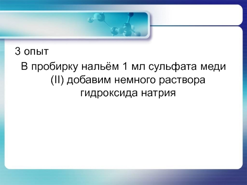 3 опытВ пробирку нальём 1 мл сульфата меди (II) добавим немного раствора гидроксида натрия