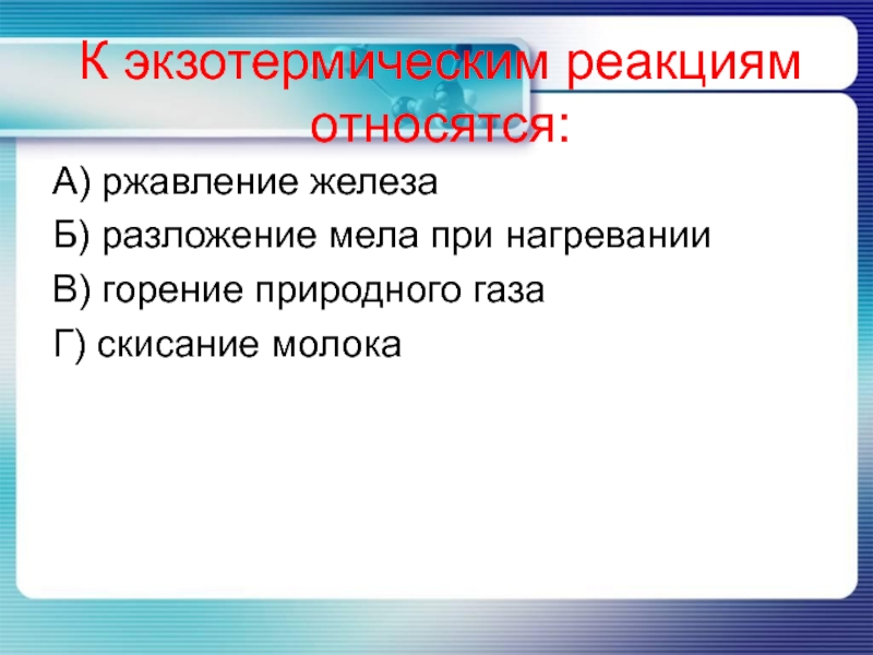 К экзотермическим реакциям относятся:  А) ржавление железаБ) разложение мела при нагреванииВ) горение природного газаГ) скисание молока