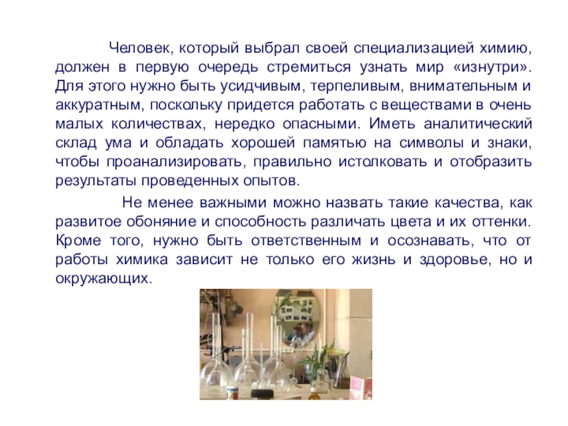 специализацией химию, должен в первую очередь стремиться узнать мир «изнутри». Для этого нужно быть усидчивым, терпеливым, внимательным и аккуратным, поскольку придется работать с веществами в очень малых количествах, нередко опасными. Иметь аналитический склад ума и обладать хорошей памятью на символы и знаки, чтобы проанализировать, правильно истолковать и отобразить результаты проведенных опытов.