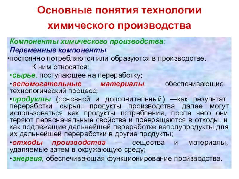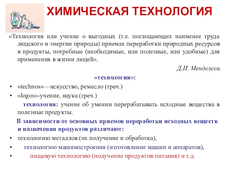 о способах и процессах производства продуктов (предметов потребления и средств производства), осуществляемых с участием химических превращений, технически, экономически и социально целесообразным путем.
