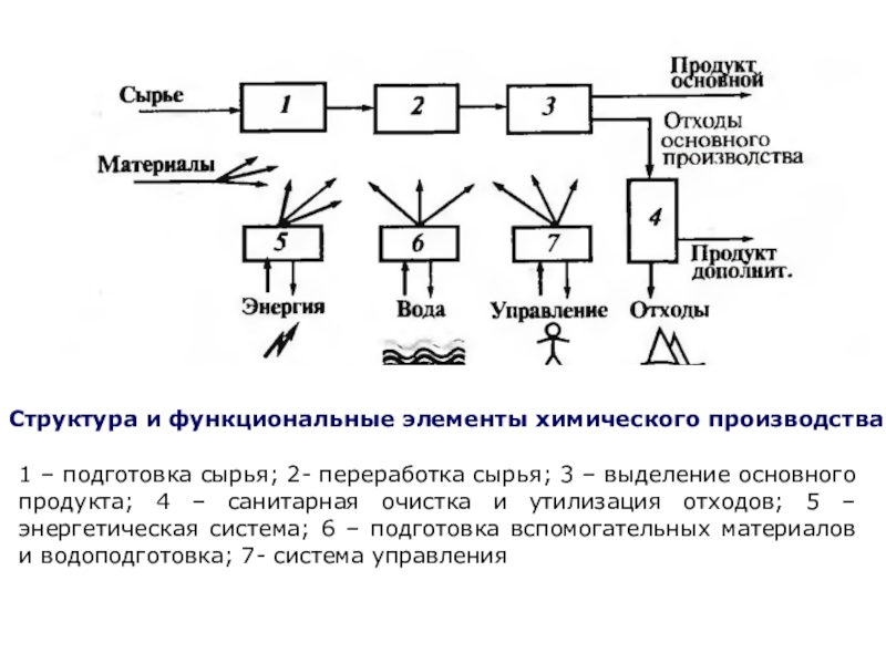 сырья; 3 – выделение основного продукта; 4 – санитарная очистка и утилизация отходов; 5 – энергетическая система; 6 – подготовка вспомогательных материалов и водоподготовка; 7- система управления