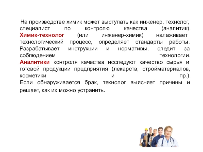 Химик-технолог (или инженер-химик) налаживает технологический процесс, определяет стандарты работы. Разрабатывает инструкции и нормативы, следит за соблюдением технологии.