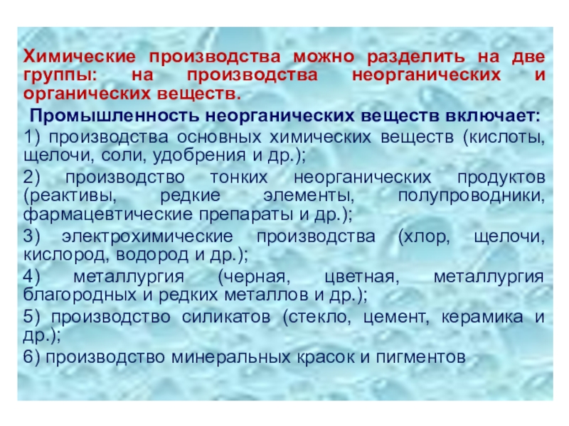 1) производства основных химических веществ (кислоты, щелочи, соли, удобрения и др.);