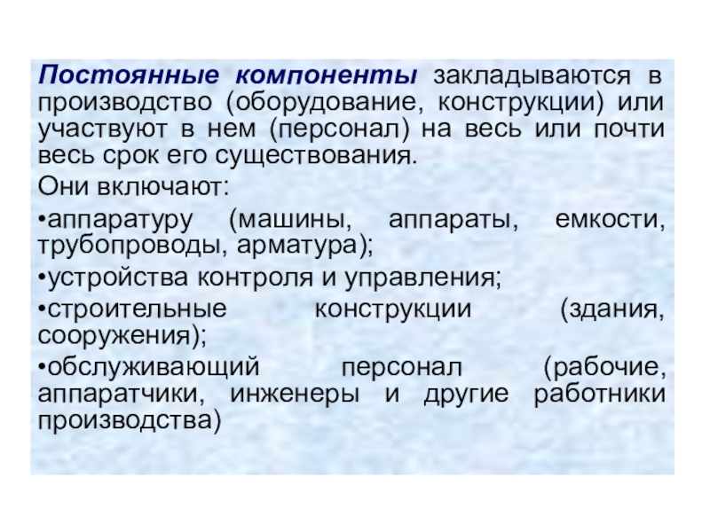 Слайд 14Постоянные компоненты закладываются в производство (оборудование, конструкции) или участвуют в нем