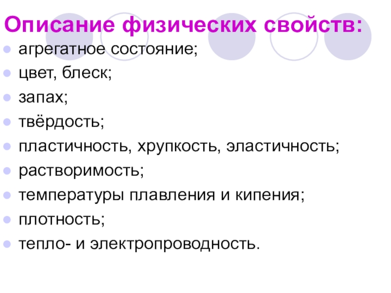 Описание физических свойств: агрегатное состояние;цвет, блеск;запах;твёрдость;пластичность, хрупкость, эластичность;растворимость;температуры плавления и кипения;плотность;тепло- и электропроводность.