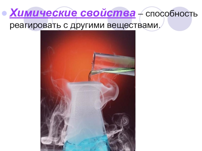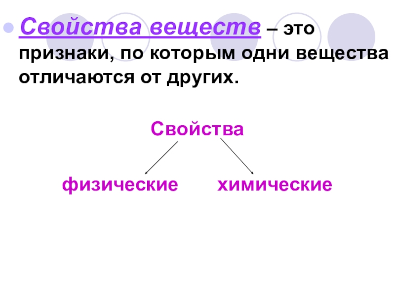 Свойства веществ – это признаки, по которым одни вещества отличаются от других.Свойствафизические    химические