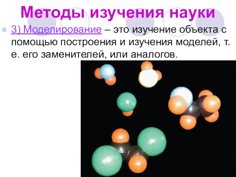 Методы изучения науки3) Моделирование – это изучение объекта с помощью построения и изучения моделей, т. е. его