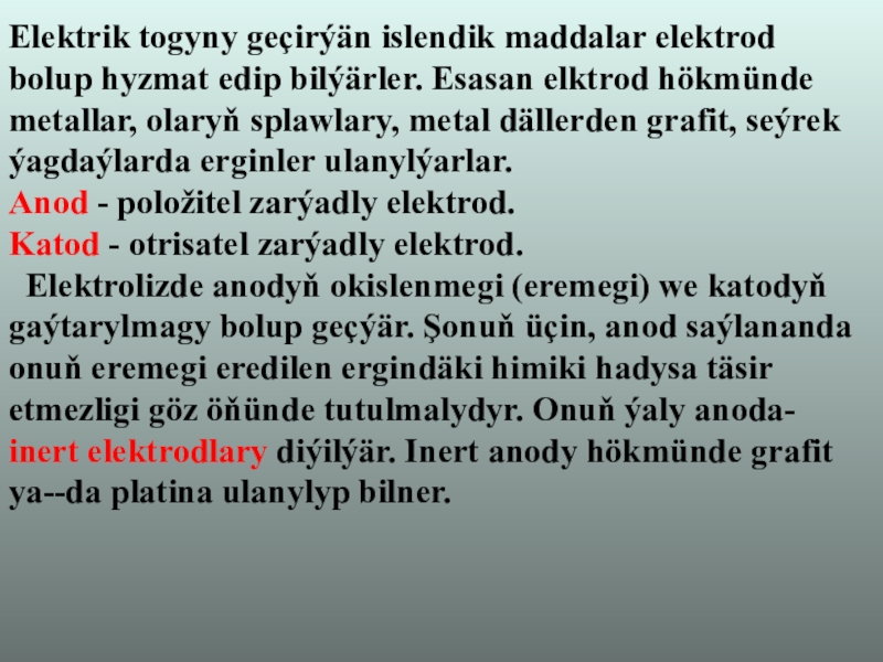 Слайд 5Elektrik togyny geçirýän islendik maddalar elektrod bolup hyzmat edip bilýärler. Esasan