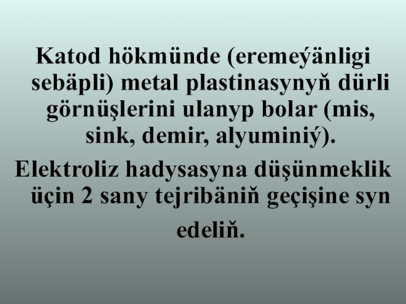 Слайд 6Katod hökmünde (eremeýänligi sebäpli) metal plastinasynyň dürli görnüşlerini ulanyp bolar (mis,