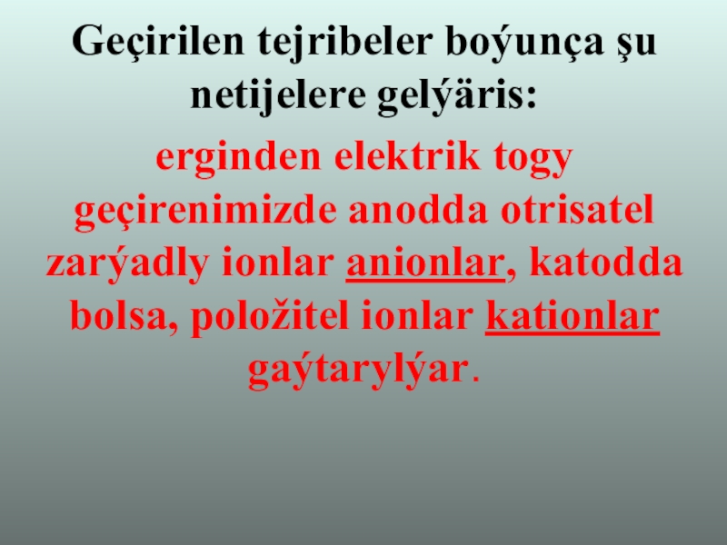 Geçirilen tejribeler boýunça şu netijelere gelýäris:erginden elektrik togy geçirenimizde anodda otrisatel zarýadly ionlar anionlar, katodda bolsa, položitel